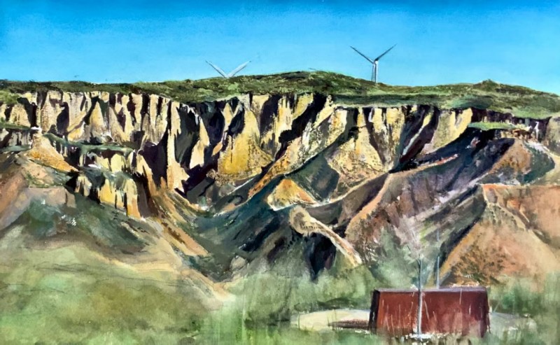 首幅水彩綜合材料畫作,其筆觸細膩得彷彿能感受到畫家指尖的温度。藝術家巧妙地運用了豐富而和諧的色彩層次,將一幅自然景觀描繪得栩栩如生。在這幅作品中,近景處的小屋顯得格外引人注目,遠景中的風車則以一種點綴的方式出現,它的輪廓在天空的映襯下顯得格外優雅。藝術家通過這種寫實與點綴的對比,平衡了自然的雄渾與人文的温度,使得整個畫面既有大自然的壯闊,又不失人間的温情。