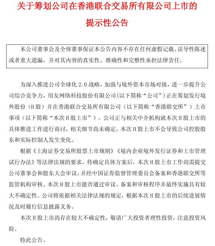 王文京重掌總裁職位後不久,4月22日,用友網絡發佈公告稱,為深入推進公司全球化2.0戰略,加強與境外資本市場對接,進一步提升公司綜合競爭力,公司正在籌劃發行境外股份(H股)並在香港聯交所上市事項。