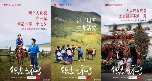 比如去年薇諾娜推出的《織女的禮物》,就是攜手雲南織錦推出匯聚天地祝福的七夕禮盒,並將這份祝福不僅送給戀人,更送給“還沒在一起的人”、“一起過週末的人”、“平時不聯繫的人”。