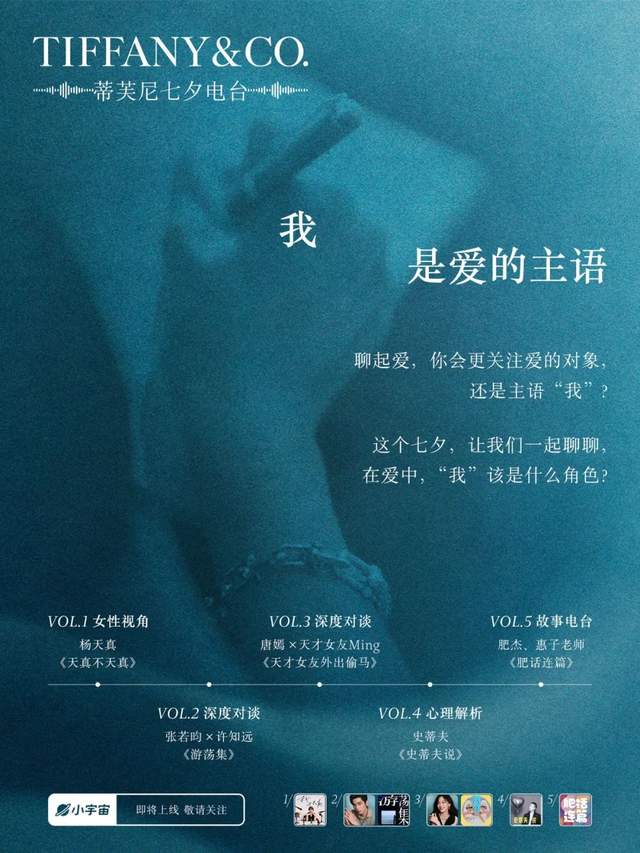 同樣是蒂芙尼的七夕營銷案例,品牌還在小宇宙上線了同名的系列播客,和楊天真、張若昀、唐嫣等合作錄製,在“如何愛”的討論當中,並強調“我”的主體性,換句話來説,它是在借“愛”的話題討論自我的成長。