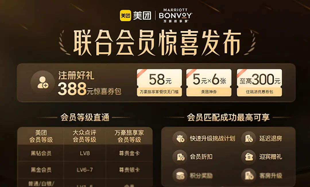 或許感知到悦己消費和情緒價值對於消費者的重要影響,今年5月,美團與萬豪國際宣佈打通會員體系,整合彼此在住宿、餐飲、本地生活等領域的資源,只要是美團黑鑽會員或大眾點評LV8,就能一鍵直升萬豪金卡,享受房型升級、延遲退房等權益,還能參加住房挑戰,直通白金卡。聯合會員上線僅一天時間,萬豪在美團上的預訂量增長了88%。