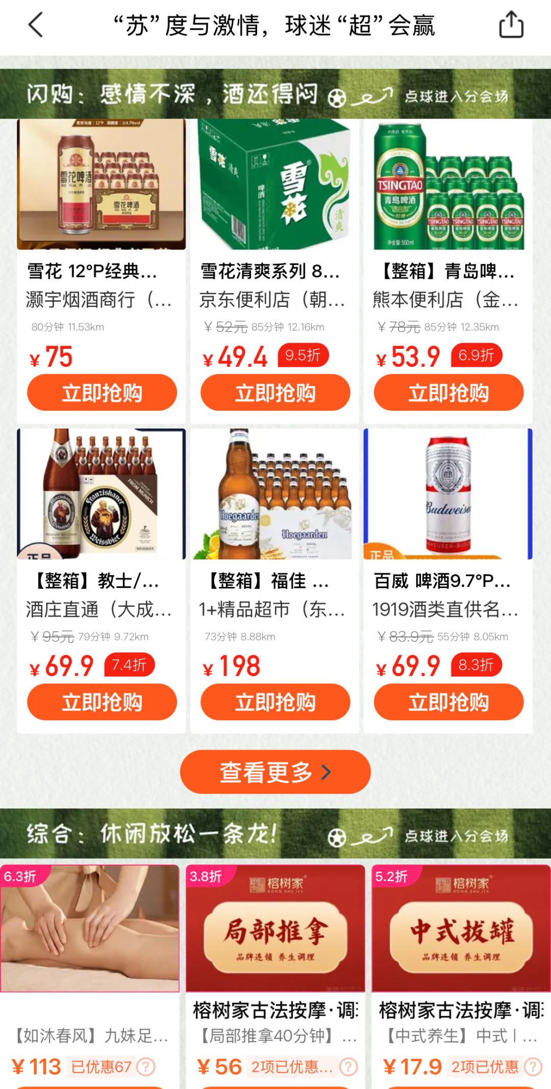 在美團的“蘇超”特供頁面,除了出行、酒旅,還專門設置了美食、休閒、閃購區,尤其是根據蘇超的場景需求,專設了啤酒類閃購渠道,以覆蓋賽事行程中的全方位消費。在美團上線“蘇超”主題套餐的江蘇商家較比賽初期增長856%,夜間休閒玩樂消費同比增長43%。