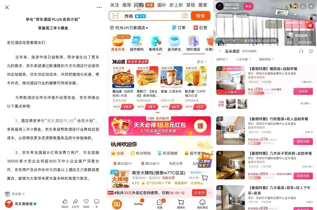 緊接着,“618”當天,京東發佈了《致全體酒店經營者公開信》,在商家側打出「三年0佣金」的招牌,吸引酒店資源——在商家成為京東PLUS會員、酒店活動力度大於原價的85折且賣價不高於其他平台時,京東會先行收取10%的佣金,在次月20日前返還。