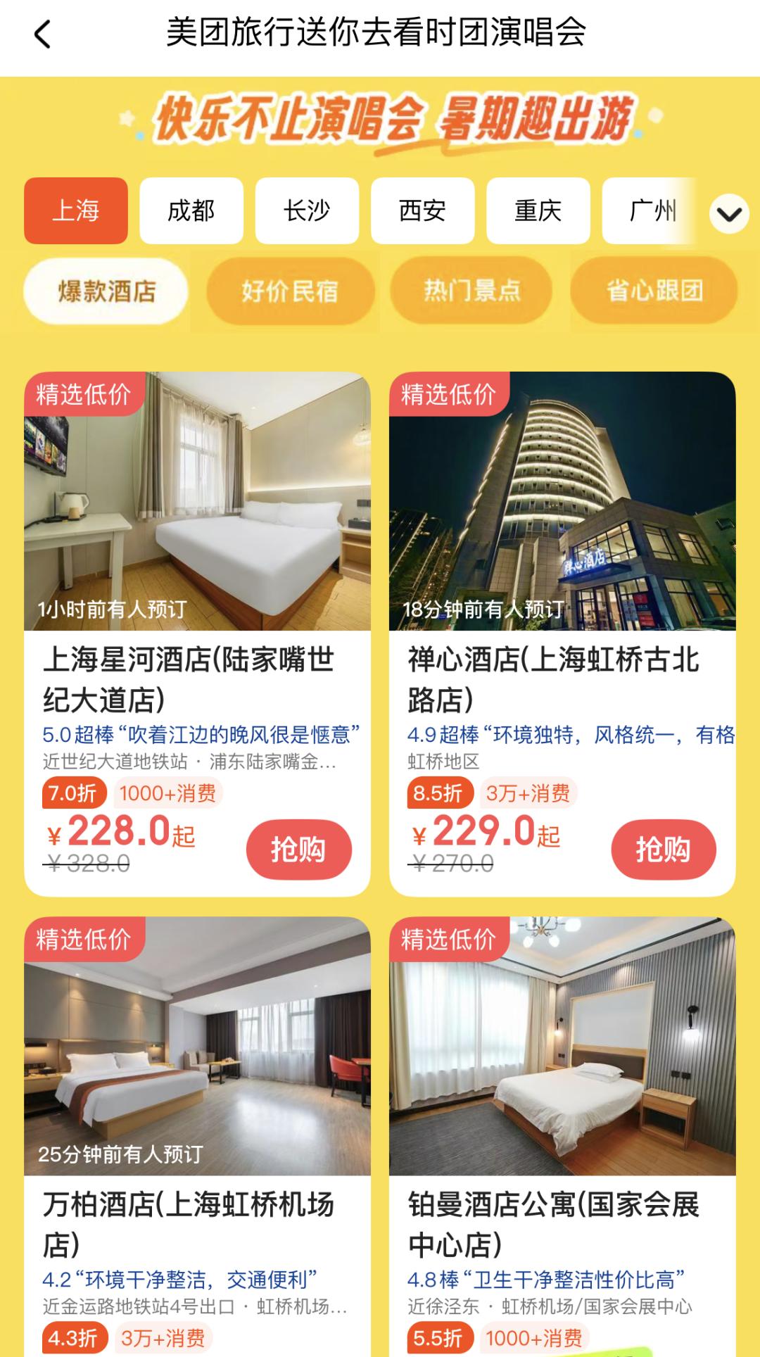 在美團搜索“時代少年團演唱會”,即可彈出以“跟着演唱會去旅遊”的明星神券界面。下拉即可一鍵式完成演唱會城市和周邊城市的酒店、民宿、景點門票預訂以及跟團遊計劃。譬如在上海場界面,美團就提供了迪士尼度假區、樂高探索中心、黃浦江遊覽等一眾行程。