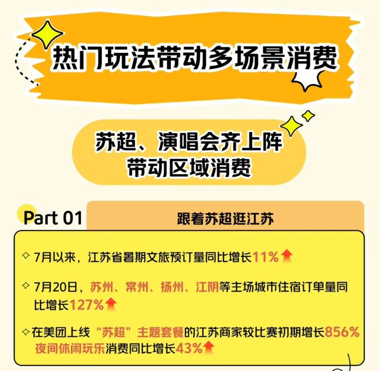 美團旅行發佈的《2025暑期熱點及趨勢報告》顯示,7月以來,美團首頁搜索“演唱會”關鍵詞同比增長134%,“時代少年團演唱會”搜索量環比增長超1000%。江蘇省暑期文旅預訂量同比增長11%,7月20日賽事主場城市住宿訂單量同比增長超127%。