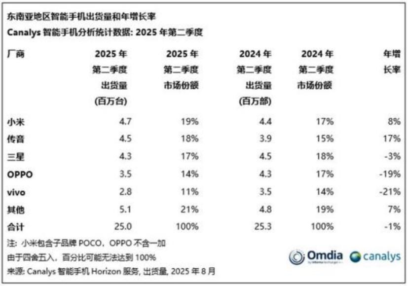 以東南亞市場為例。根據Canalys數據,今年二季度小米在東南亞雖然以19%的市場份額取得了第一的成績,但是優勢並不名明顯。傳音、三星、OPPO和vivo分別以18%、17%、14%和11%位列2-5位。