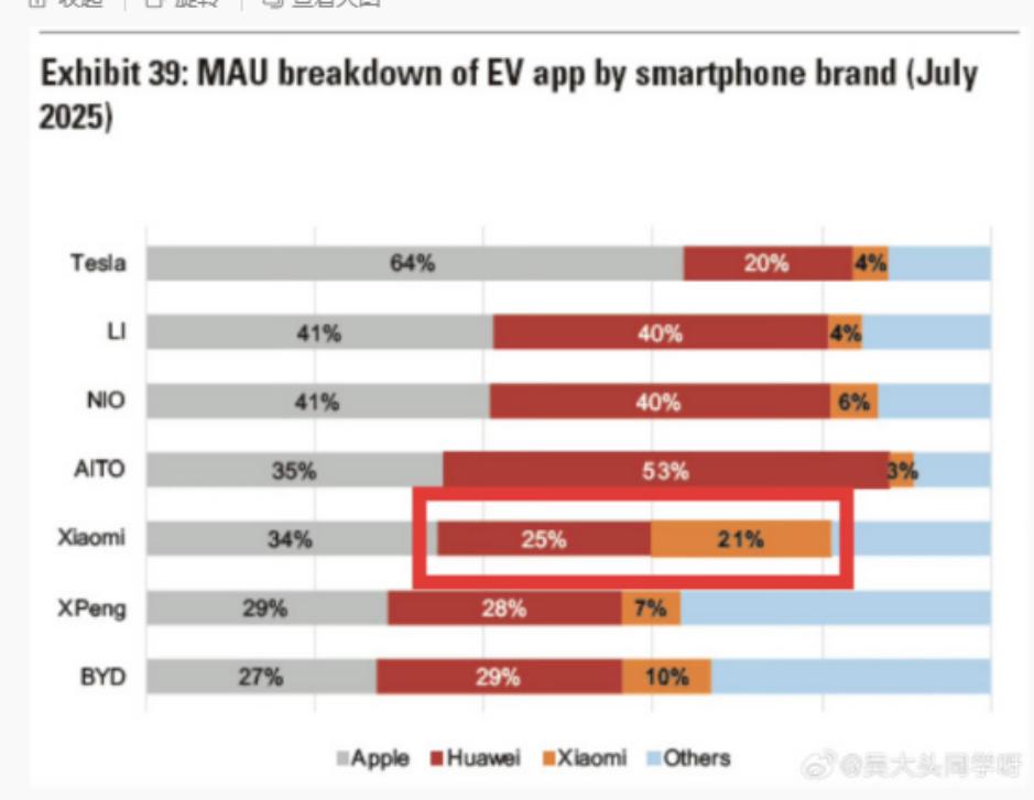 其次,小米汽車帶來的高端影響力仍在強化。二季度,小米汽車平均售價已超過25萬元(含税價超過28萬元),接近寶馬、奔馳、奧迪在中國的30萬元均價。而根據外媒此前披露的一份數據,小米汽車的用户中,使用小米手機的比例只有21%,使用華為手機和蘋果手機的比例分別為25%和34%。