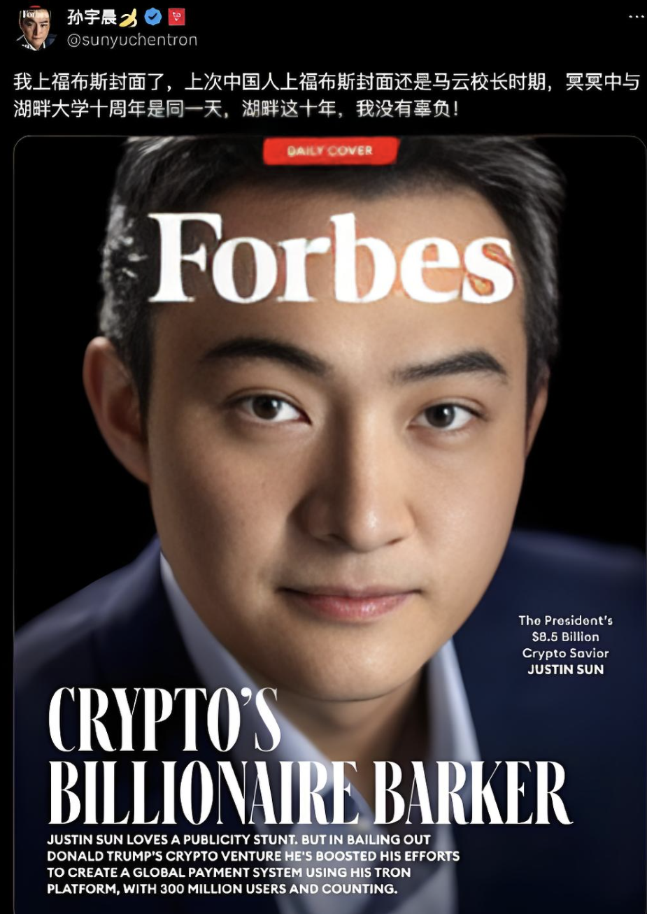 登上《福布斯》封面時,孫宇晨在X平台發文,稱很榮幸被稱為“加密領域的億萬富翁領航者”。