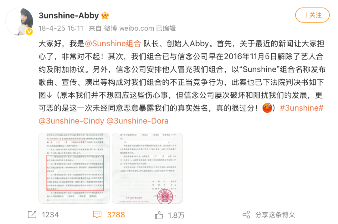 Sunshine組合引發熱議的“出道”微博