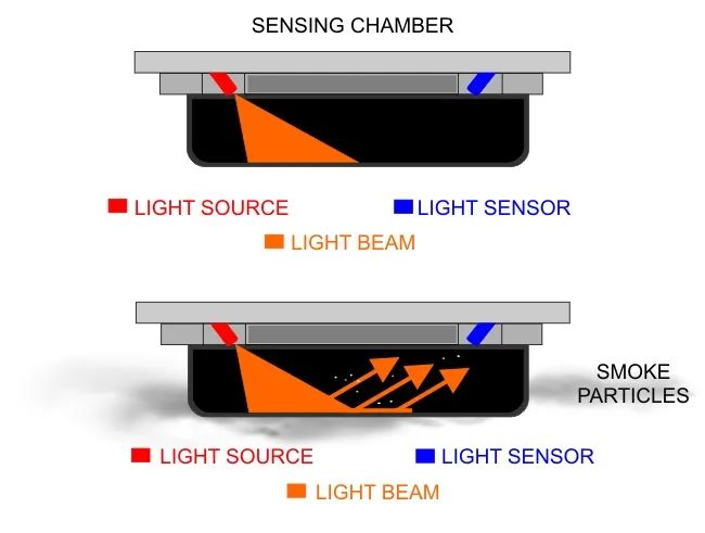 煙霧報警器主要分為“光電式”和“電離式”兩種。光電式煙霧報警器又可以細分為減光式和散射光式——散射光式光電煙霧報警器內部像一個小迷宮,一邊裝着發光二極管(LED),另一邊裝着光敏傳感器,LED會每10秒發射一束脈衝光。正常情況下,LED發出的光線照不到傳感器;而當煙霧進入腔室時,光線會發生散射,部分光線會到達傳感器。傳感器將光信號轉換為電信號,然後觸發警報,提醒人們注意火災。