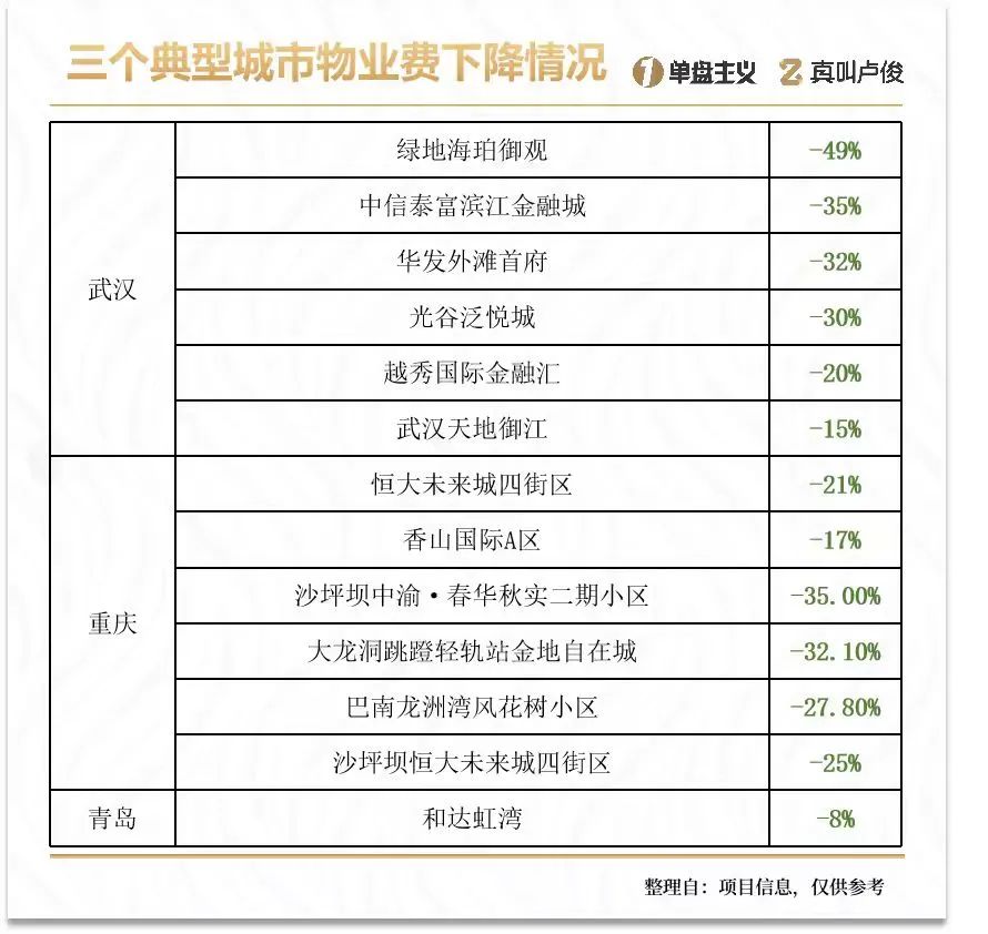 其中武漢綠地海珀御觀物業費就從7.6元/平方米·月調整為3.84元/平方米·月,降幅極大