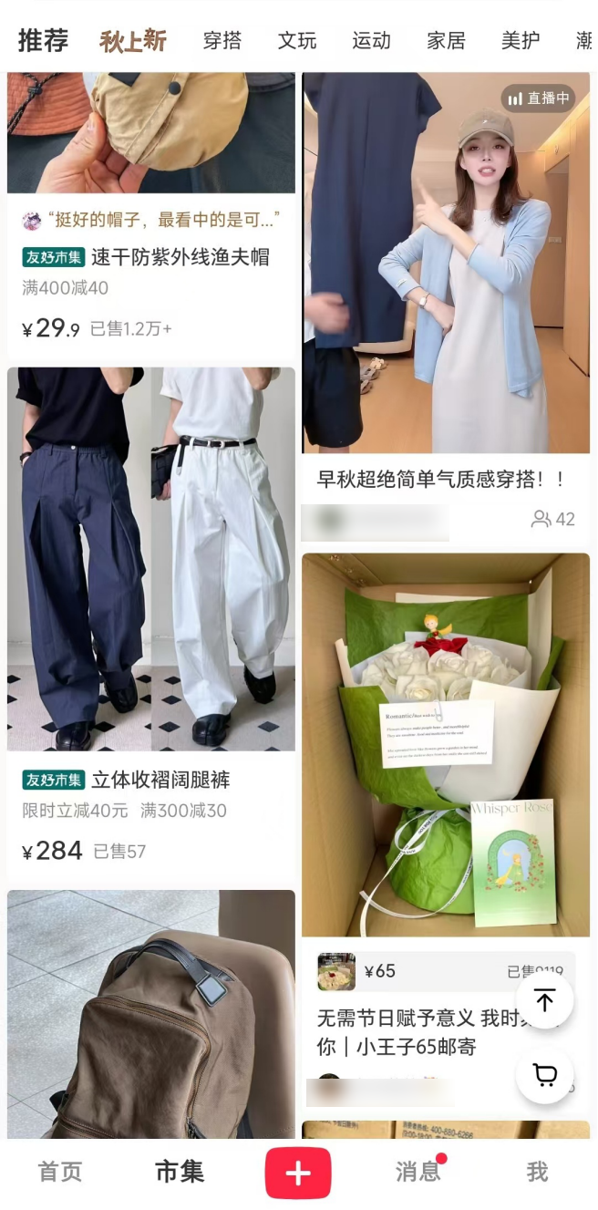 而對於內容消費的用户而言,獨立交易場景也起到了“緩衝”作用。面對“蘿蔔白菜、各有所愛”的用户,原有的商品筆記、帶貨直播等內容仍然會在社區,根據興趣有算法推薦,而對於購物意願更強烈的用户來説,市集則是一個快速滿足需求的地方。隨着小紅書購物心智的不斷滲透,或將成為更多人想要買東西時的首選。