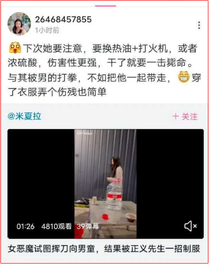 現在這些極端組織越來越駭人聽聞了。精神病女子手持摺疊刀威脅小男孩事件發生後,有極端女權分子已經開始教人用硫酸、打火機行兇了。