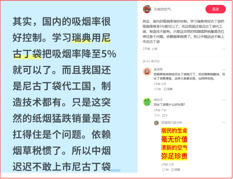 然而這個尼古丁袋,危害性更大更直接。她這個做法,就相當於在晚清時期高喊要禁絕鴉片,説鴉片有害健康。但同時她又偷偷拿出了海螺因,説鴉片煙癮犯了,可以直接上海螺因。