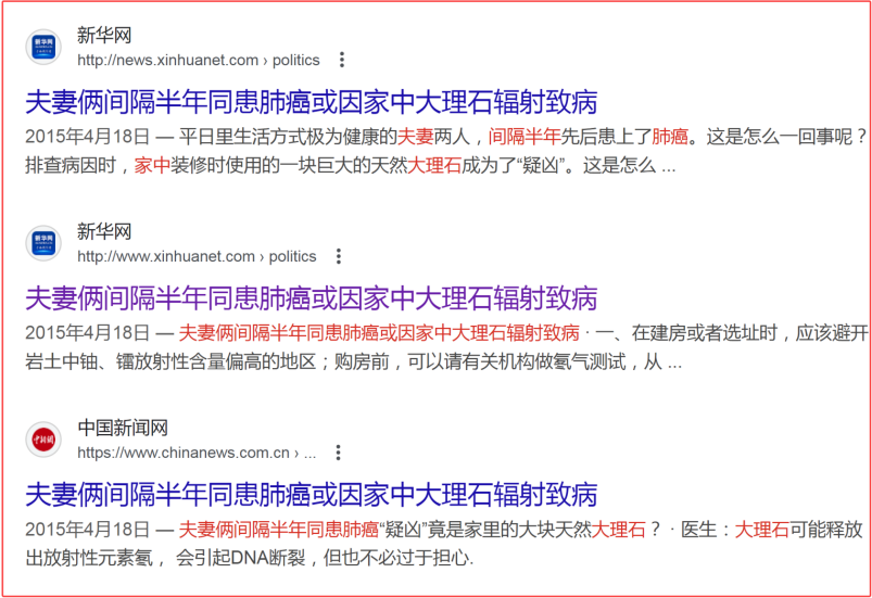 問題是裝修公司為了推廣人造石材可不是這麼説的,他們會説天然石材含有氡,是家裝中的隱形殺手,新華網、央視網甚至中國新聞網都都介紹過相關案例。