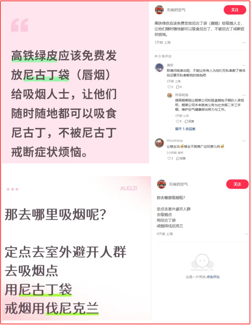 也許這就是這位女士非常着急的原因。她在個人主頁的自我介紹中説,最遠大的目標,就是讓煙草電子煙OUT,只可“尼古丁袋”。她小紅書的賬號中,從來沒有提及尼古丁袋的危害。