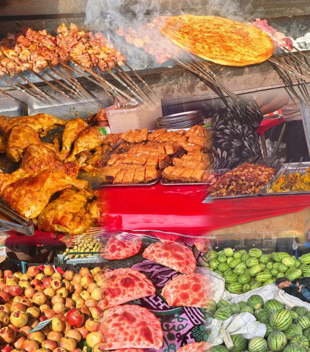 烤肉攤前,維吾爾族大叔用紅柳枝串着羊肉,炭火烤得滋滋冒油,撒上孜然和辣椒麪,香得讓人走不動道。