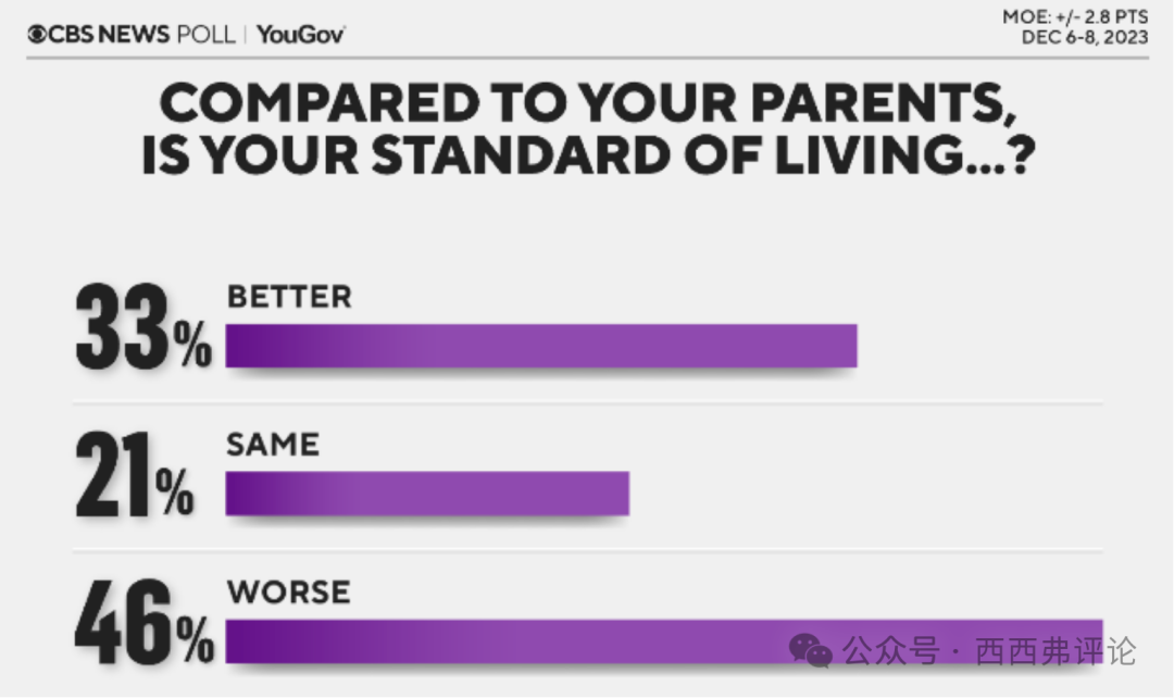 2023年,哥倫比亞廣播公司(CBS)新聞的民意調查發現 ,46%的美國人表示他們的生活水平比父母差,33%的人表示他們的生活水平更好,21%的人表示他們的生活水平差不多。其中30-64歲的人,有51%表示生活水平比父母差。