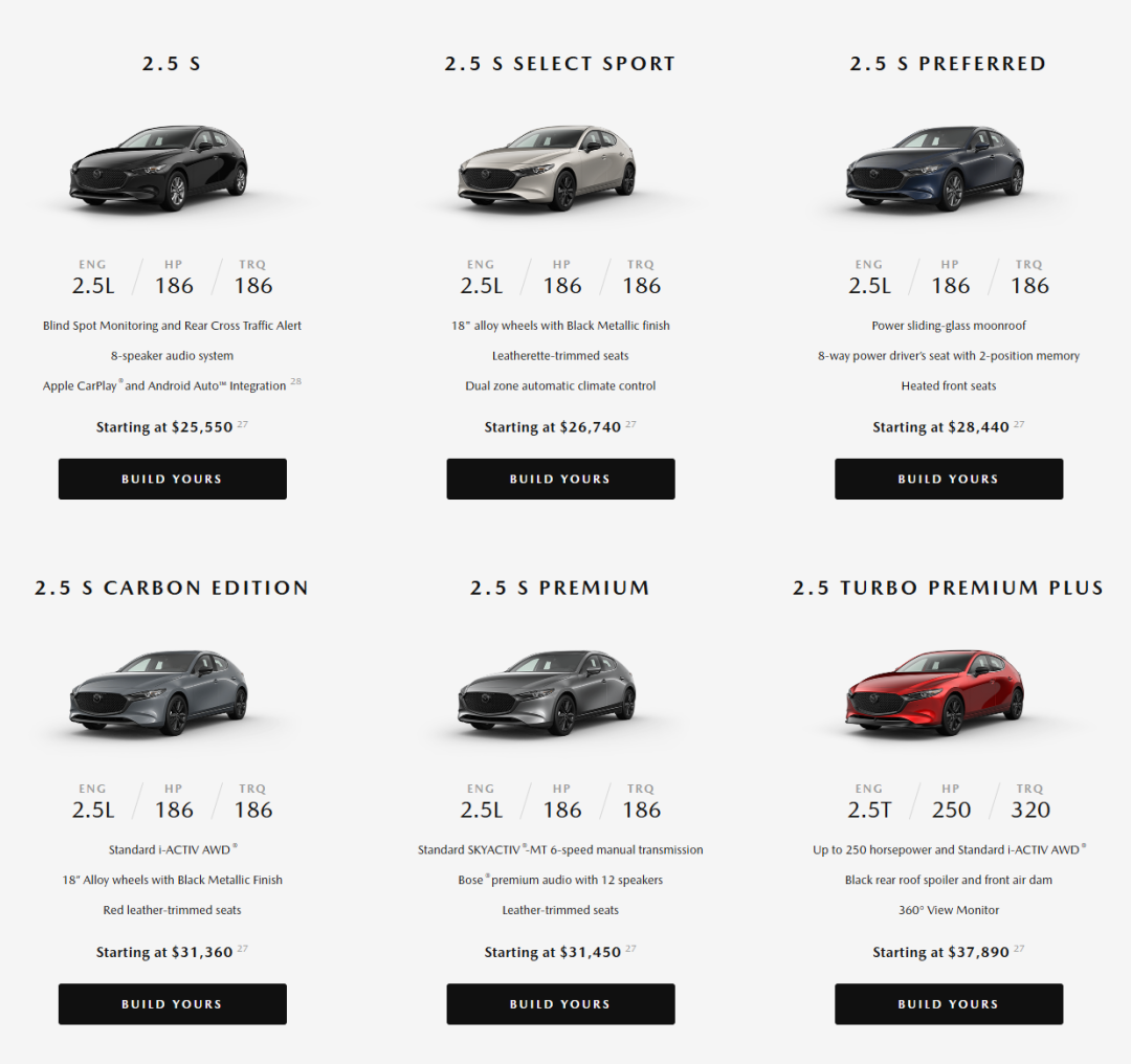這次 26 款的北美馬自達一共分 6 個版本,分別是:2.5 S、2.5 S Select Sport、2.5 S Preferred、2.5 S Carbon Edition、2.5 S Premium ( 6MT ) 和 2.5 Turbo Premium Plus。