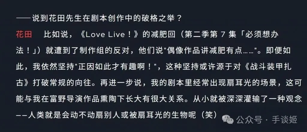 為什麼花田對扇巴掌這麼情有獨鍾呢?他還真在動畫媒體Febri的訪談裏回答過。有興趣的姬友可點擊手談姬公眾號左下角閲讀原文看全文。