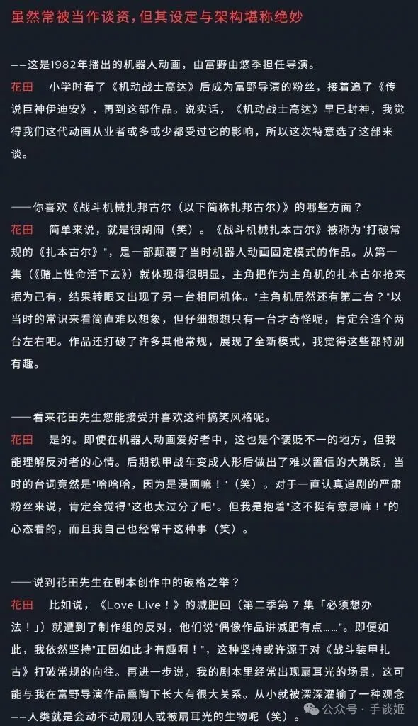 可能有姬友不是很清楚花田提到的這位富野導演是誰,沒關係,我們換個説法。各位姬友們聽説過《機動戰士高達》系列的鼎鼎大名嗎?