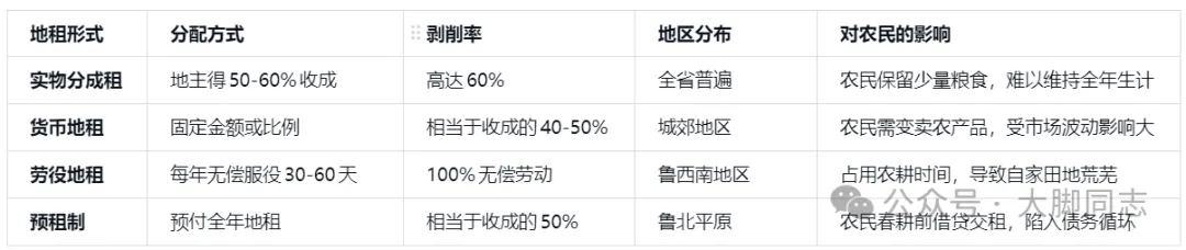 地租剝削是地主榨取農民剩餘勞動的主要方式。在山東地區,地租形式主要有實物地租、貨幣地租和勞役地租三種,其中實物地租最為普遍。地主通常採取分成租制,比例從對半分成到倒四六分成(地主得六成)不等。遇到災年,地主往往不肯減少地租,迫使農民借債交租,從而陷入高利貸的陷阱。
