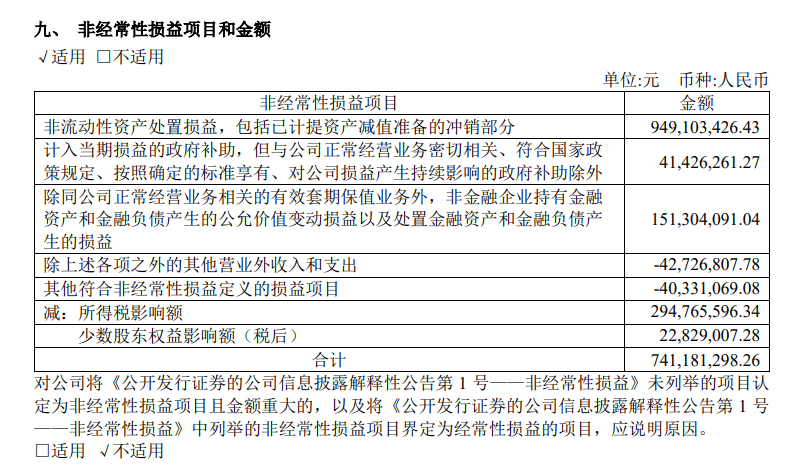 那淨利潤為什麼還能漲?答案藏在"非經常性損益"裏。其中僅"非流動性資產處置損益"就有94.91億元。