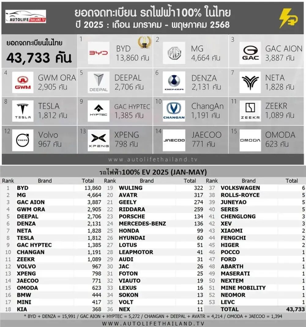 事實上,並不僅僅是比亞迪,今年1-5月,泰國純電新車註冊量TOP15,中國品牌包攬了13席。