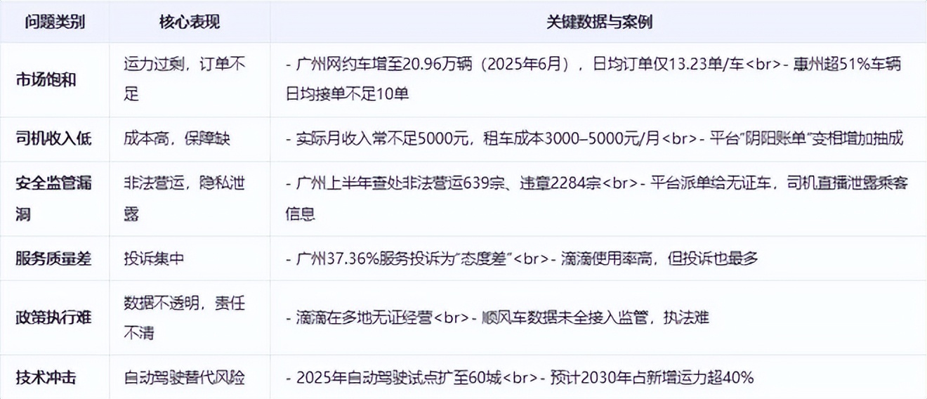 市場飽和與供需失衡是最突出的問題。2025年上半年,廣州、深圳、佛山等城市網約車數量持續增加,但訂單增長乏力。廣州市網約車數量從2024年底的18.5萬輛增至2025年6月的20.96萬輛,但日均訂單量僅13.23單/車。惠州市網約車日均訂單不足10單的車輛佔比超51%,東莞、佛山等製造業強市同樣面臨運力過剩問題。這種供需失衡導致價格戰頻發,平台通過低價補貼爭奪市場份額,但最終損害了行業健康發展。