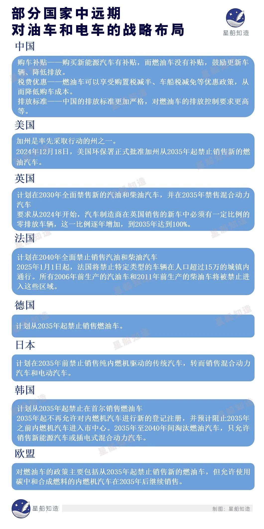 《星船知造》大致梳理了全球幾個主要國家,歐盟以及幾大汽車公司中遠期對燃油車及新能源車的戰略佈局。