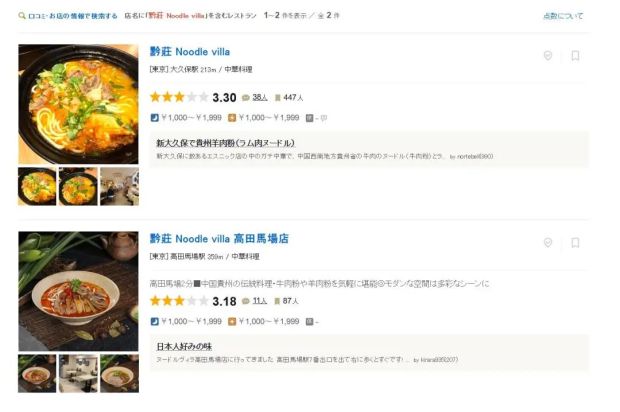 在好奇心的驅使下,我去日本最大的食評、探店網站之一、有着日本某團和某眾點評之稱的“美食日誌”(Tabelog,食べログ)網上查了一下,結果發現,這份牛肉/羊肉粉是從一家開在東京的、名叫“黔莊”的貴州菜館子那兒打來的外賣。“黔莊”目前在東京一共開有兩家,一家是位於大久保站的總店,另一家是開在高田馬場站的分店。這兩家的平均消費是一樣的,都是人均1000至1999日元,約合人民幣48元至97元。