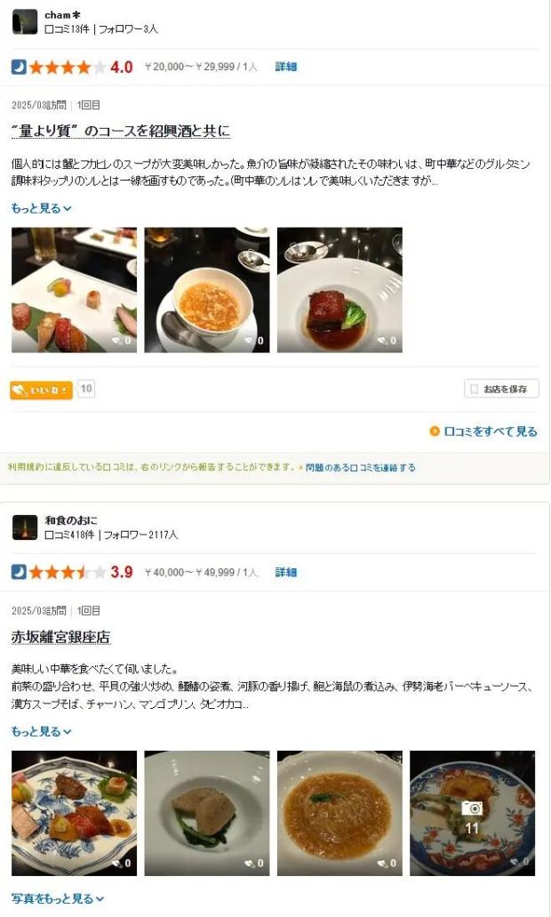 我瞅了一眼他們家的食客返評,人均消費就沒有低於6000日元的,中位數大約在15000到20000左右,吃到3萬甚至5萬以上的食客也不在少數。而且,這些來赤坂璃宮吃飯的日本人往往都是花得越多,評分就越高。