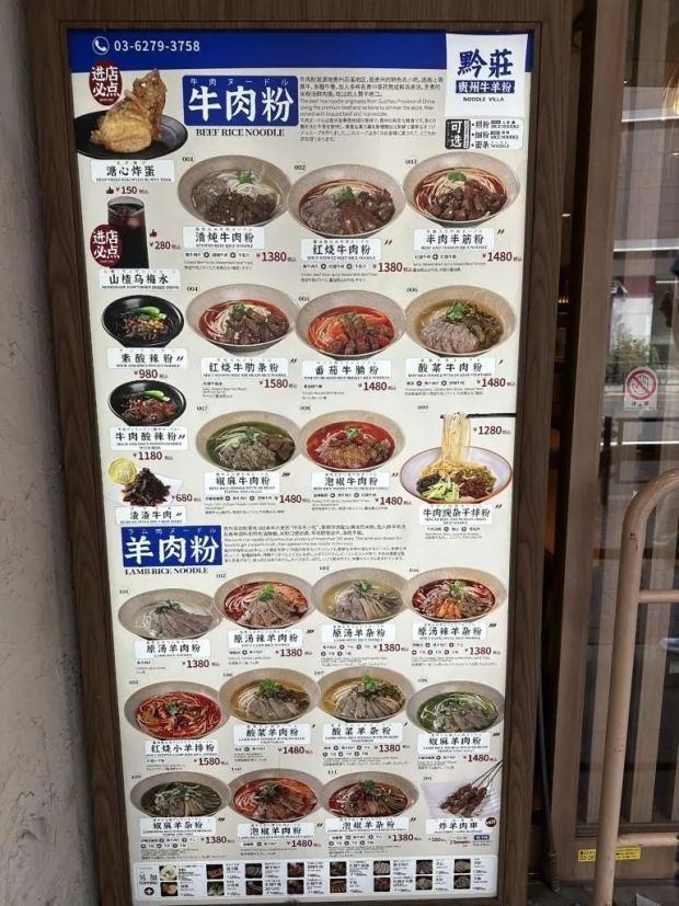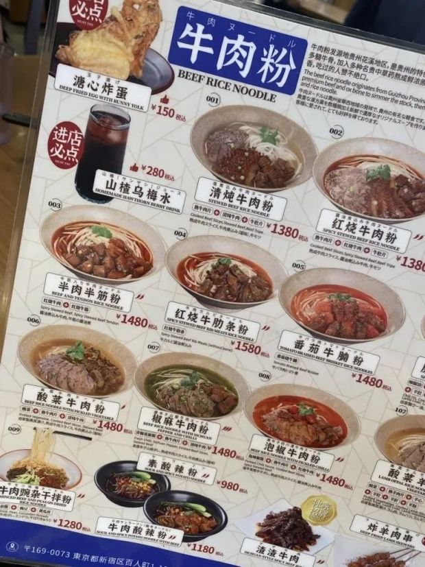 從“黔莊”家的菜單來看,他們提供的菜品確實也都是在這個消費區間的,從最便宜的1380日元(約合67元人民幣)一碗的清燉牛肉粉,到最貴的1580日元(約合76元人民幣)一碗的紅燒牛肋條粉,你在他們家點一份牛肉/羊肉粉的花費至多不會超過1500日元,完了再配上280日元(約合人民幣13元)一杯的招牌山楂酸梅湯,一頓飯下來確實也控制在2000日元以內就搞定了,再打包一份白米飯和兩份小菜啥的,頂天也就2500日元出頭,摺合人民幣120元左右。
