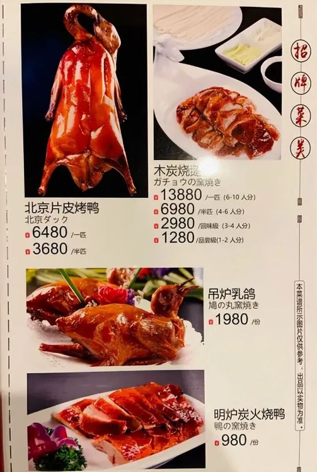 唯一的問題是,這些招牌菜的價格普遍不便宜,一隻吊爐乳鴿要賣1980日元(約合人民幣96元),這個價錢都快趕上“黔莊”他們家一份定食的開銷了;半套片皮烤鴨要賣3680日元(約合人民幣178元),全套要6480。最貴的還得數木炭燒鵝,一隻整的燒鵝要賣13880日元,摺合人民幣674元。