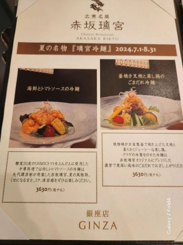 如果王懿的潤朋殖友嫌“鵝一燒”low,配不上王懿的身份,那東京還有一家上檔次的、有燒鵝賣的粵菜館子可供選擇,這就是開在銀座的“赤坂璃宮”。這家店在“美食日誌”的評分高達3.73,距離頂級餐廳的4分標準僅有半步之遙,這哪怕在東京也算是很高的評價了。
