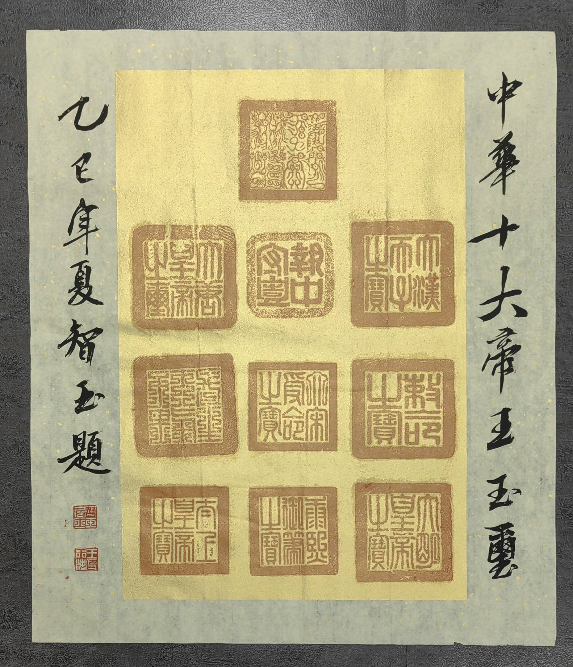 印譜掛圖實為玉璽的代言人。這些原本深藏九重的皇家信物,通過精摹妙拓得以聚首一堂,宛如召開千秋帝王盛會。製作時,能工巧匠以虔誠之心對待方寸天地:擇紙如選帛,必取江南宣紙或蜀中綾絹為材;調朱如煉丹,必選辰州硃砂調以南海珍珠粉;運刀如執筆,必依原璽筆意再現王者風範。