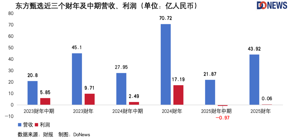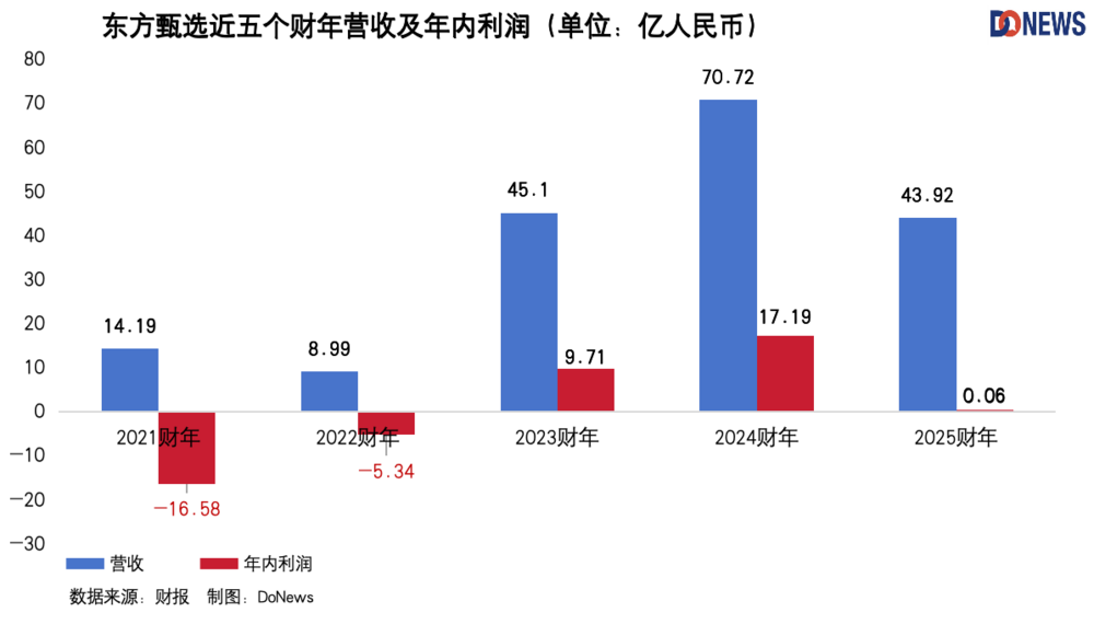 近五年,東方甄選的營收和利潤經歷了大起大落,2025財年的表現同步大幅下滑,但這有個前提,即東方甄選主動剝離了與輝同行的影響(2024年7月25日)。彼時外界議論紛紛,但這實際上是對於雙方最好的選擇(“體面分手”後,新東方爬出低谷 | DoNews財經),其決定性因素有三: