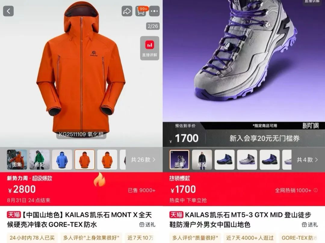 凱樂石的硬殼衝鋒衣已經漲到2800元,千元級越野鞋也成為主打單品,甚至推出萬元級攀登裝備,幾乎在明面上對標始祖鳥。有趣的是,漲價反而成效明顯,凱樂石天貓官方旗艦店顯示,其新品MT5登山徒步鞋,售價達到1700元,已有超4000人加購。