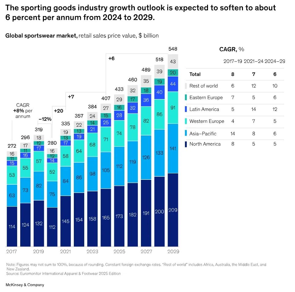 麥肯錫數據顯示,2021–2024年北美和西歐户外運動服飾市場年均增速約5% 和7%;而展望2024–2029 年,西歐的增速將放緩至5%,北美也趨於停滯。與之對應的,亞太地區經歷了2021到2024年的狂飆後,雖放緩至6%,但由於綜合體量大,仍是高端品牌尋找新增量的首選市場。