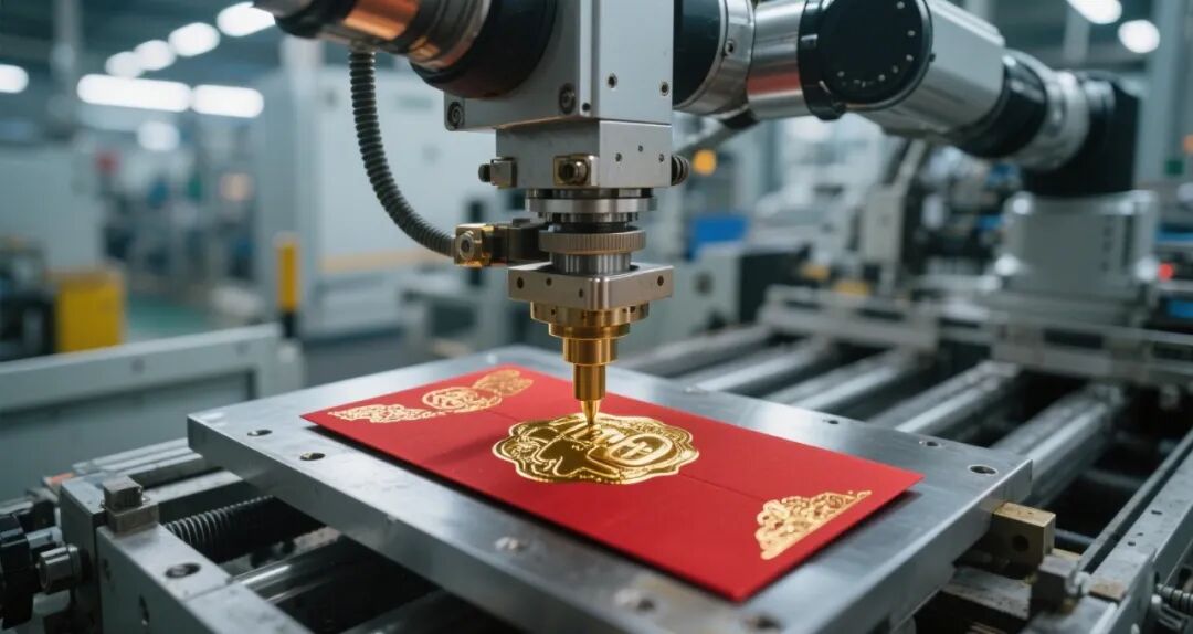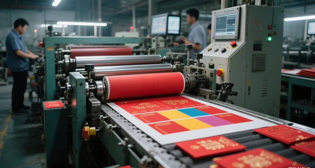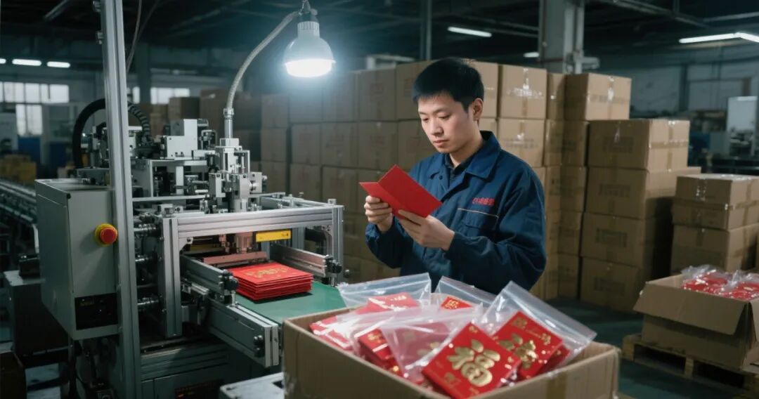 在機器的精準律動中,鮮紅的紙張在自動化生產線上飛速流轉,眨眼間,便被印刷、剪裁、粘合,變成了一個個承載着祝福與喜悦的紅包。