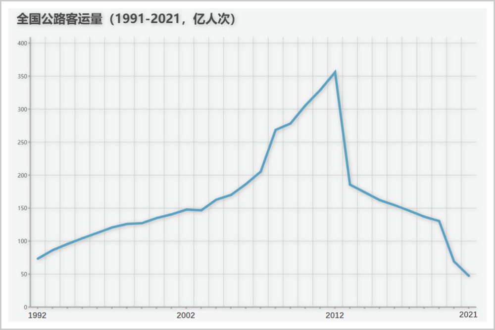 最直觀的體現,來自一組慘烈的數據。2012年,全國公路客運量高達355億人次。到2021年,只剩下47億人次,不及前者的零頭。