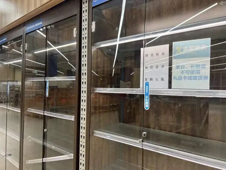 名酒區的貨櫃,只有茅台的櫃子裏還有部分酒。工作人員説:“那些櫃子空的都是折扣酒,當時每人限購五瓶,早就賣空了。”