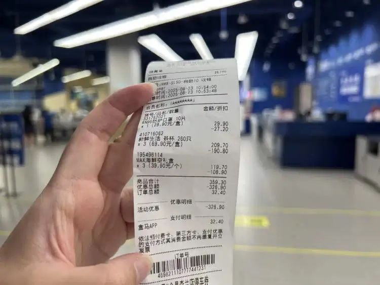 何女士購買了紙茶杯和海鮮空禮盒,她向記者展示收銀小票時略顯驚訝:“原價359.3元的商品,最後只付了32.4元。就是剩的商品不多了,有用的都買一下。”