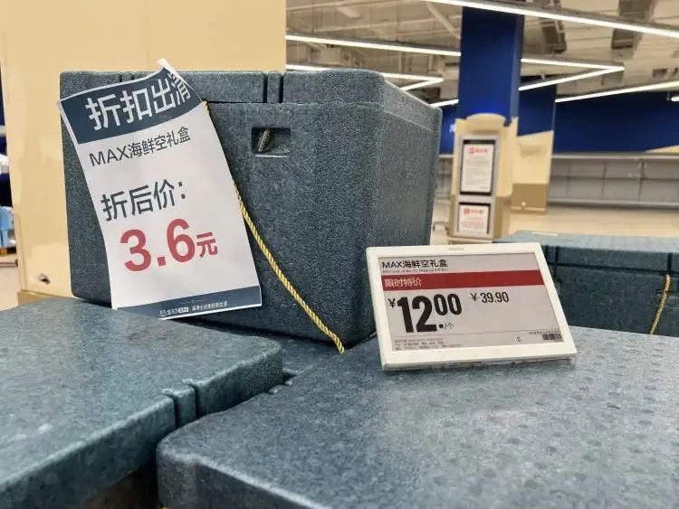 小山般的MAX海鮮空禮盒堆疊在場地中央,十分醒目。原價39.9元/個的冷鏈泡沫箱,現在只要3.6元一個。