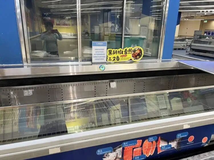 從原先的冷櫃區走到水產區,所有的貨櫃、水箱都空着。“以前這裏是真不錯,”陳先生感慨道,“東西多,有逛頭,每次牛奶、酸奶、三文魚是必買的。夏天的時候買點小龍蝦,還有盒馬的一大特色就是活帝王蟹。”