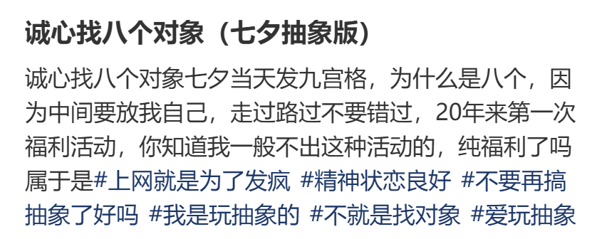 用幽默包裝自己其實想脱單的心情,在這一天緊鑼密鼓蒐集七夕專屬抽象文案和段子,假裝不經意地在朋友圈徵集對象