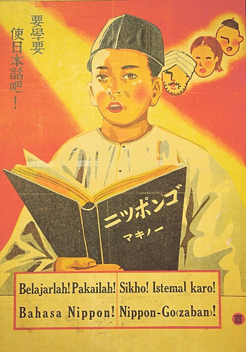 日佔時期海報,鼓勵馬來人學習日語並採納日本文化日軍不僅釋放了被英國人囚禁的激進馬來民族主義領袖,還大力宣傳“馬來亞是馬來人的馬來亞”等口號,並將馬來語定為官方語言之一。他們將大量馬來青年招募進警察和輔助部隊,用以對付華人的抗日遊擊隊。這種做法極大地激化了族羣間的矛盾,使得原本的經濟和文化差異升級為流血對立。