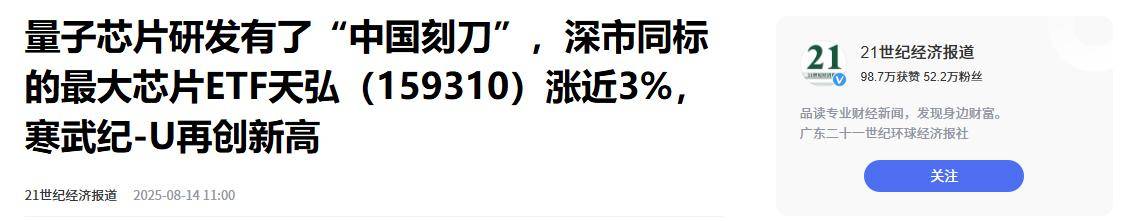 21世紀經濟報道:量子芯片研發有了“中國刻刀”,深市同標的最大芯片ETF天弘(159310)漲近3%,寒武紀-U再創新高