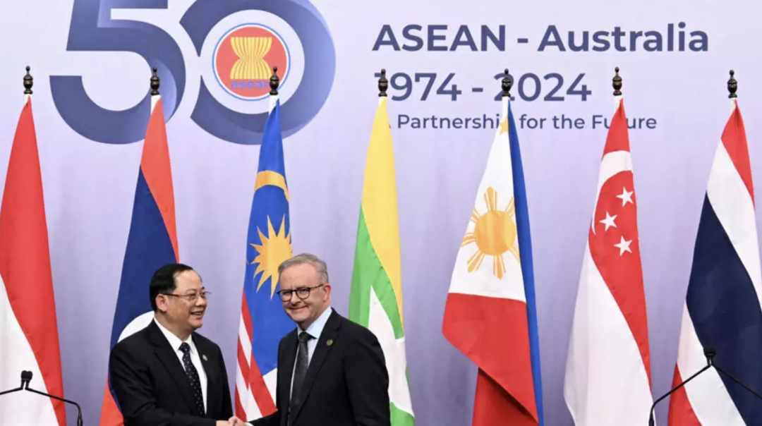 2024年3月6日,澳大利亞總理阿爾巴尼斯在墨爾本澳大利亞-東盟特別峯會上與時任東盟輪值主席國老撾總理宋賽·西潘敦聯合出席記者會(圖源:路透社)