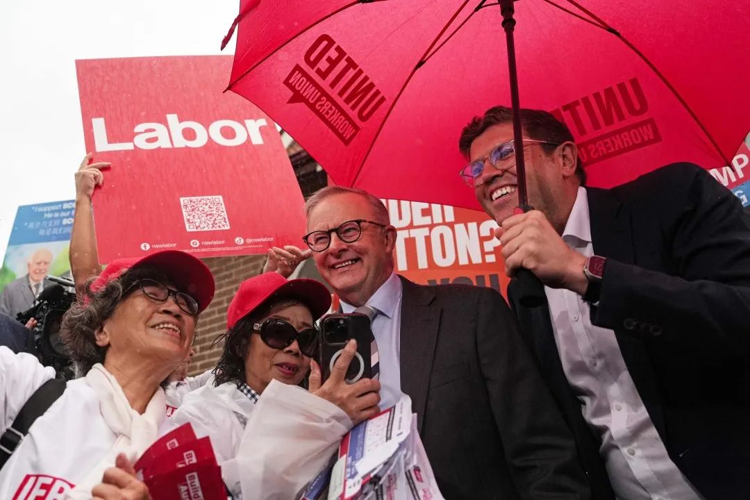 2025年4月28日,澳大利亞總理阿爾巴尼斯與工黨貝內隆選區議員傑羅姆·拉克薩勒在提前投票站與選民會面(圖源:Getty Images)